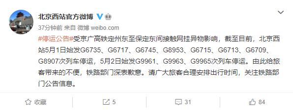 北京西站官方微博发布停运公告,受京广高铁定州东至保定东间接触网挂异物影响,截至目前,北京西站5月1日始发G6735、G6717、G6745、G8953、G6715、G6713、G6709、G8907次列车停运,5月2日始发G9961、G9963、G9965次列车停运。由此给旅客带来的不便,铁路部门深表歉意。请广大旅客合理安排出行时间,关注铁路部门公告信息。