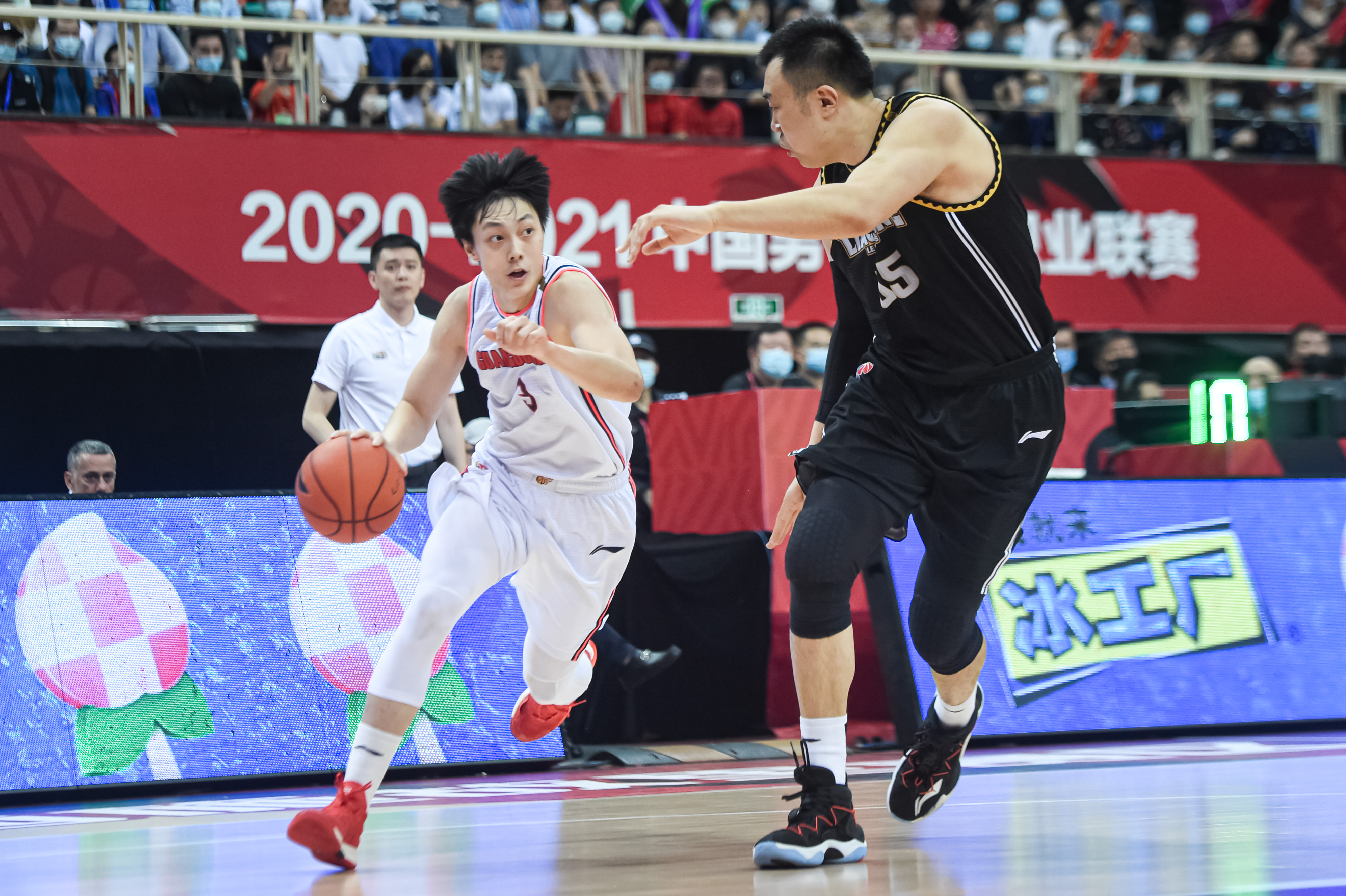 广东队球员胡明轩(左)在比赛中突破辽宁队球员韩德君的防守。新华社记者江汉摄