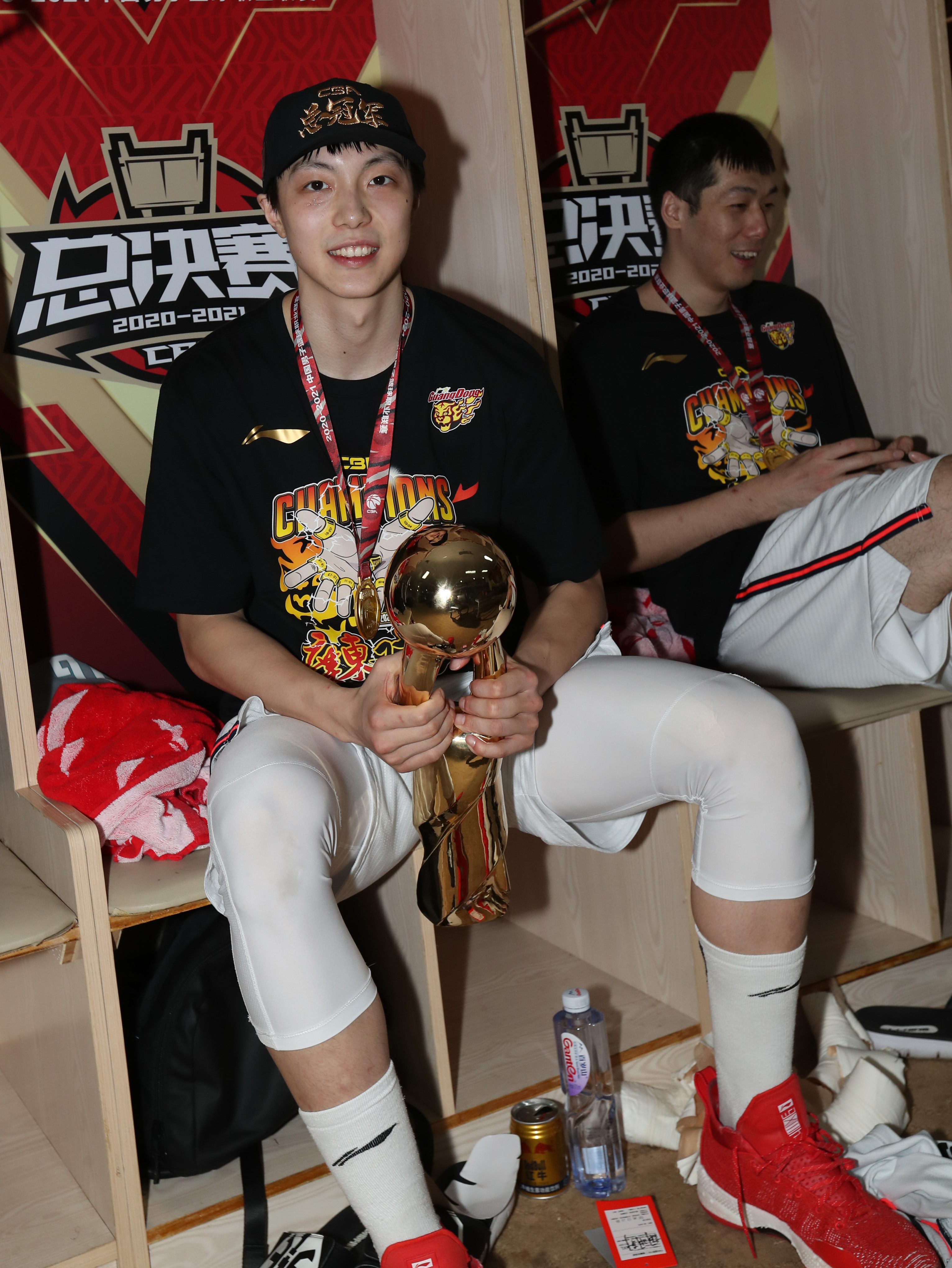 获得总决赛最有价值球员奖的胡明轩(左)在更衣室。新华社记者孟永民摄