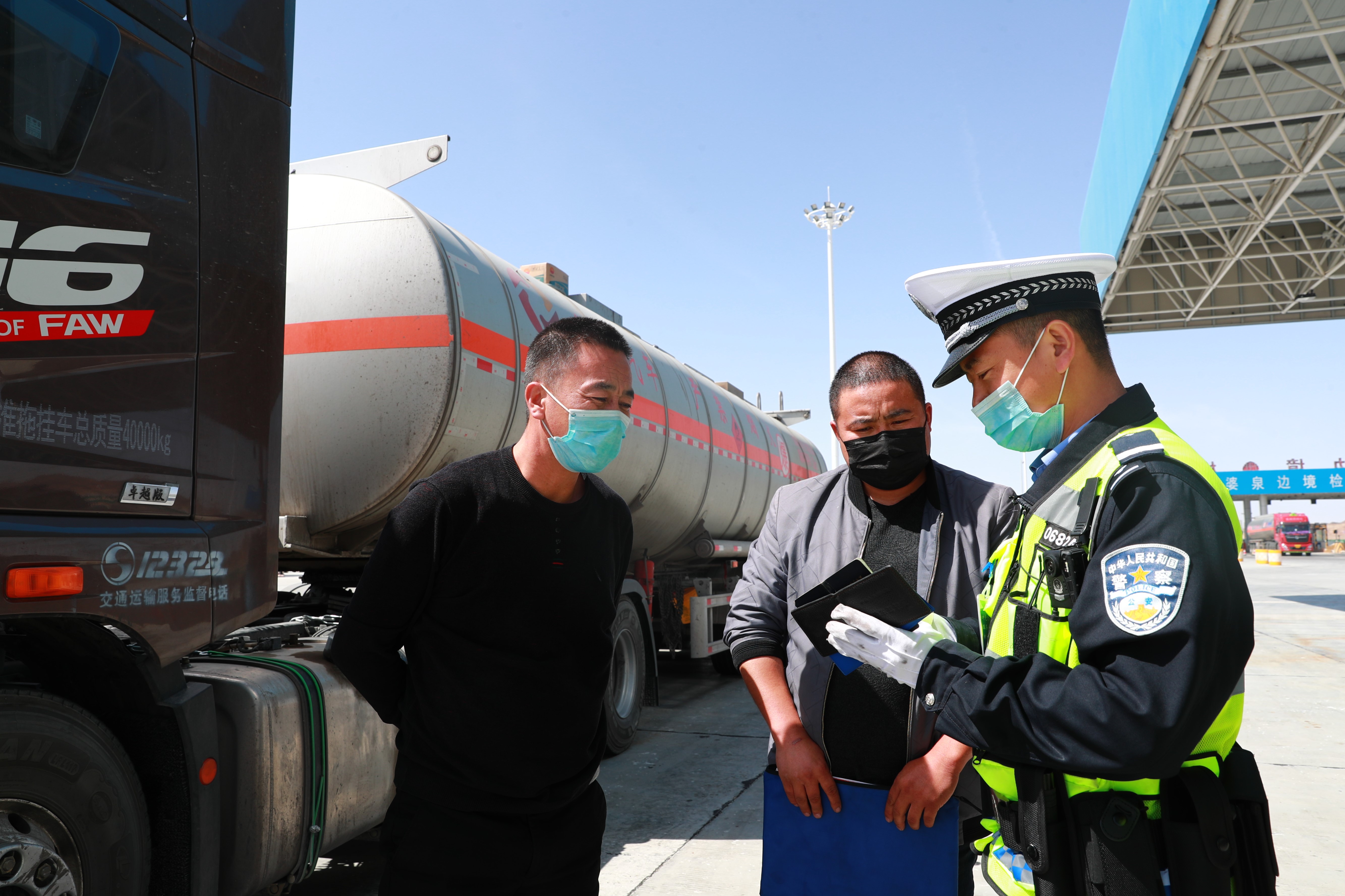 在京新高速甘肃段公婆泉边境检查站,马鬃山高速公路大队民警王永斌在登记危化品运输车辆信息。新华社发(杜哲宇摄)