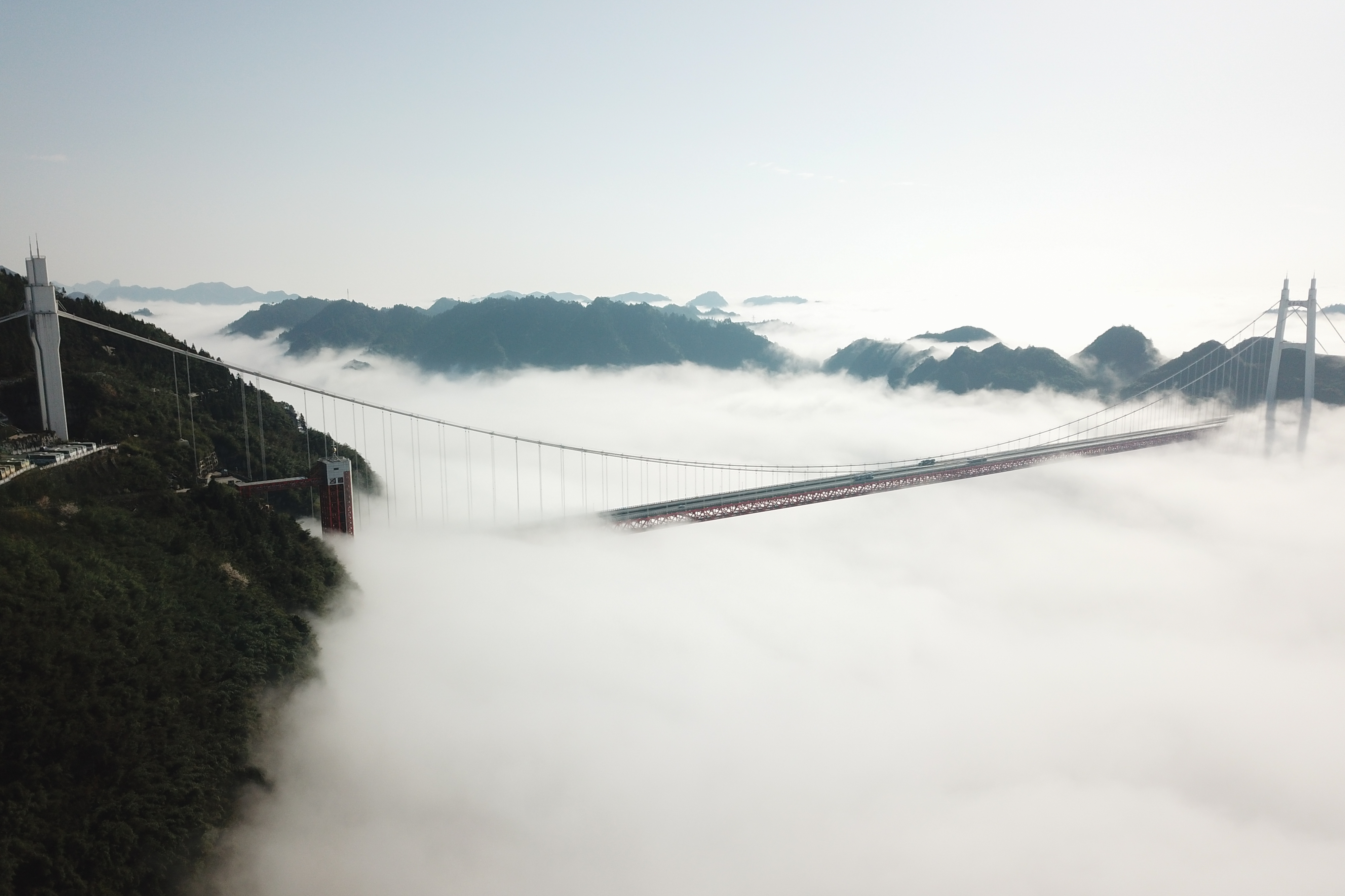 在湖南省湘西土家族苗族自治州吉首市矮寨镇,包茂高速上的矮寨特大悬索桥云海缭绕。新华社发(刘振军摄)