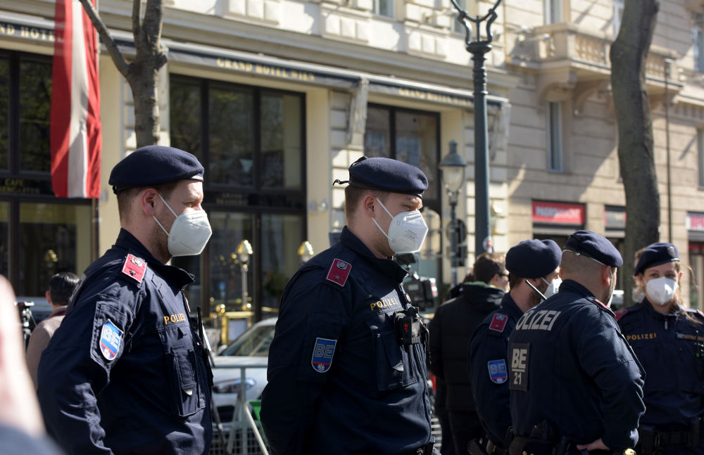 4月9日,警察在奥地利维也纳伊朗核问题全面协议会场外执勤。新华社记者 郭晨摄