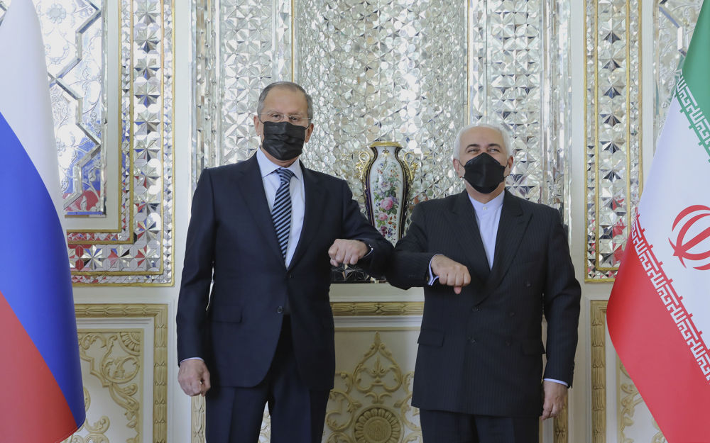 4月13日,伊朗外长扎里夫(右)在德黑兰与俄罗斯外长拉夫罗夫碰肘致意,双方共同呼吁美国解除对伊朗制裁,以使美伊恢复履行伊朗核问题全面协议。新华社发