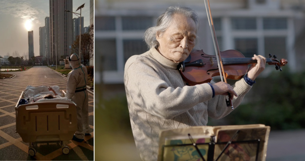 这是一张拼版照片,左图为:2020年3月5日傍晚,在湖北省武汉大学人民医院东院,复旦大学附属中山医院支援湖北医疗队医生在护送患者王欣做CT的途中停下,让住院近一个月的老人欣赏久违的日落(甘俊超 摄);右图为:3月24日,“看夕阳的老人”王欣在东西湖区园艺花城小区内拉小提琴(新华社记者熊琦摄)。