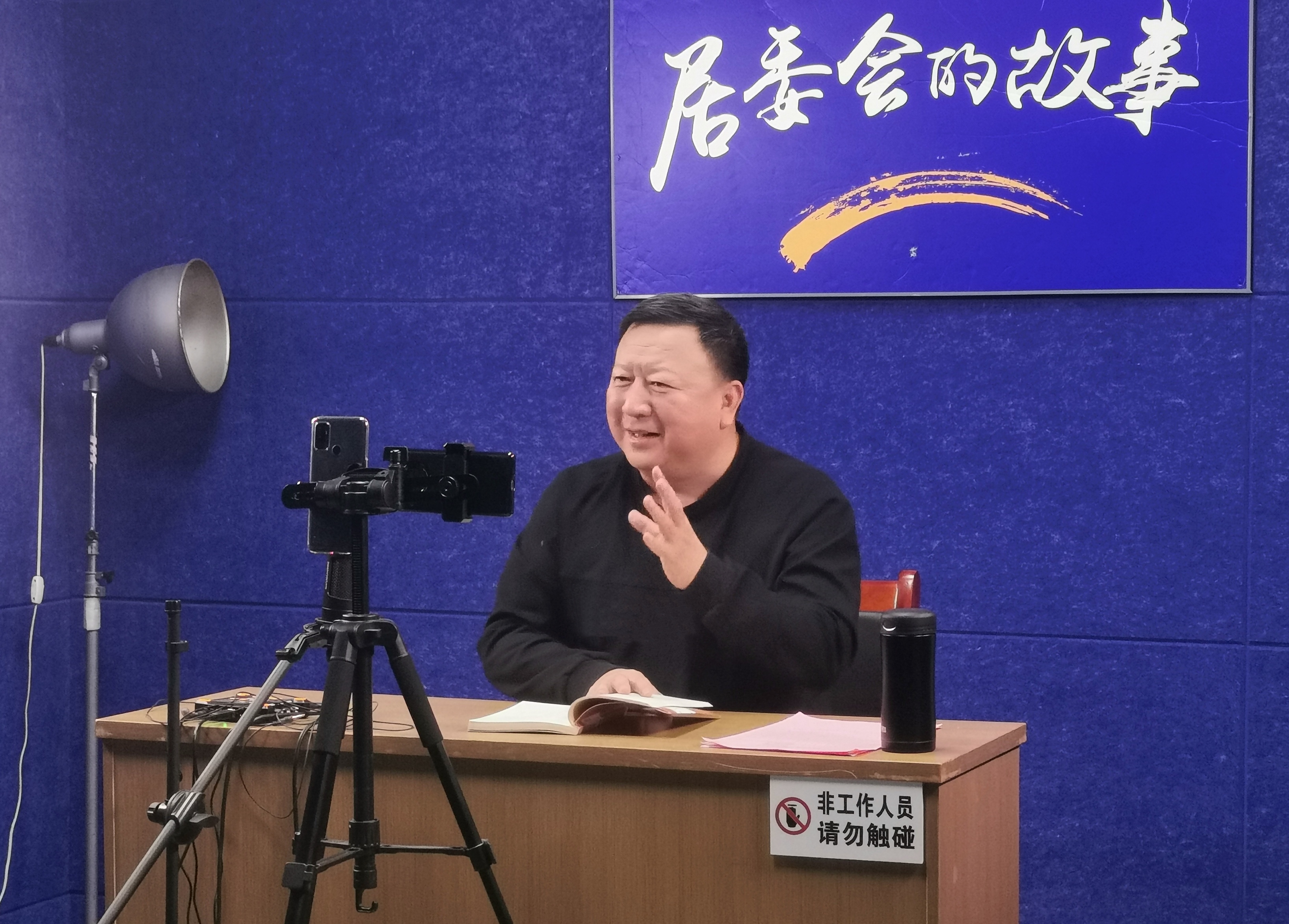 ↑图为杨肖虎在社区办公室里做直播。新华社记者张力元 摄