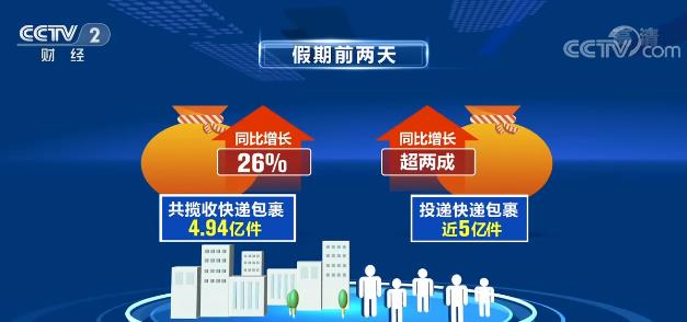 实体商超人气回暖的同时,线上消费依然旺盛。国家邮政局监测数据显示,假期前两天,共揽收快递包裹4.94亿件,同比增长26%;投递快递包裹近5亿件,同比增长超两成。