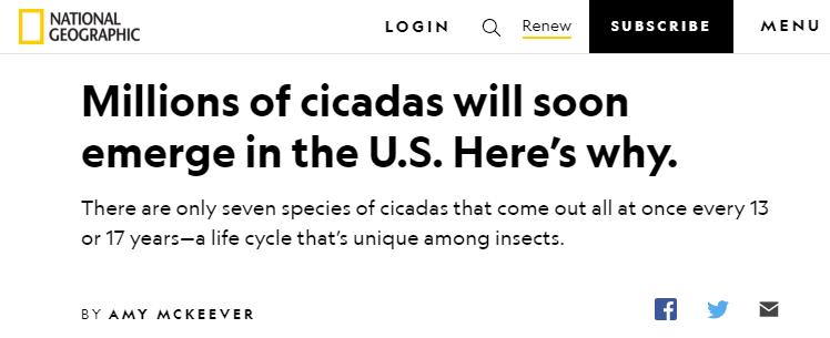 自2月起,北美地区就开始有零星媒体报道,这两天同一个主题逐渐登上了各大媒体的头版。因为时隔17年,北美地区特有的17年蝉(Brood X批次)将在今年夏季破土而出。