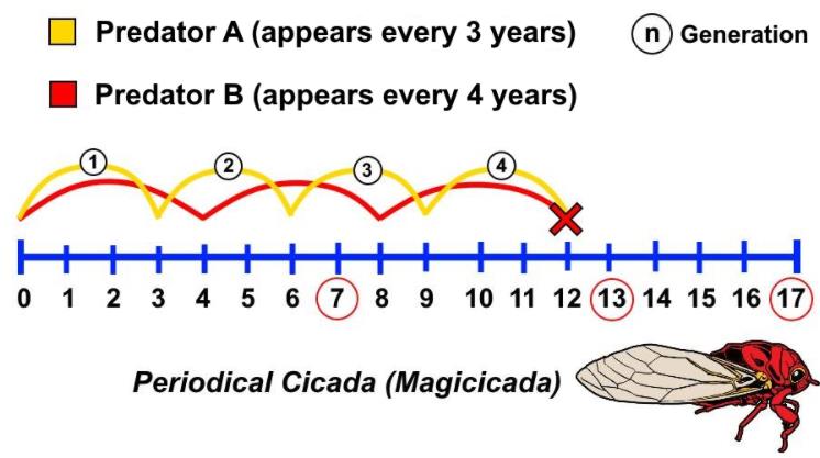 不过由于没有发现任何14、15或16年蝉存在,13与17这两个数字就显得十分特殊。科学家们推想,可能是因为13与17是两个质数,他们的公约数只有1与其本身。这样就能有效减少与周期性出现的天敌在同一年相遇,并降低某一年或某几年生态环境变化对蝉种群造成的影响。