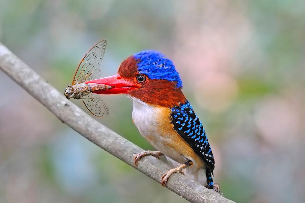 △一只雄性束带翠鸟正在捕食一只蝉(图中蝉的种类相对普通,每年均有出现,并非周期蝉)