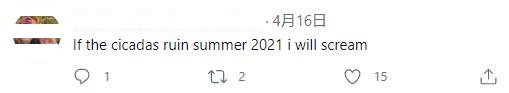 △社交网络上,一名外国网友对今年即将大量出现的17年蝉表达自己的不满。她说:“如果2021年的夏天被蝉毁了,我会叫出声来的。”
