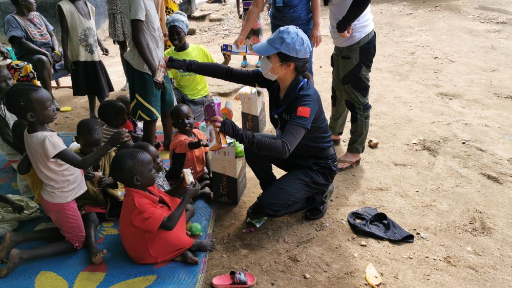 2020年10月,在南苏丹首都朱巴,维和警队队员廖洁慰问当地孤儿院的儿童。新华社发