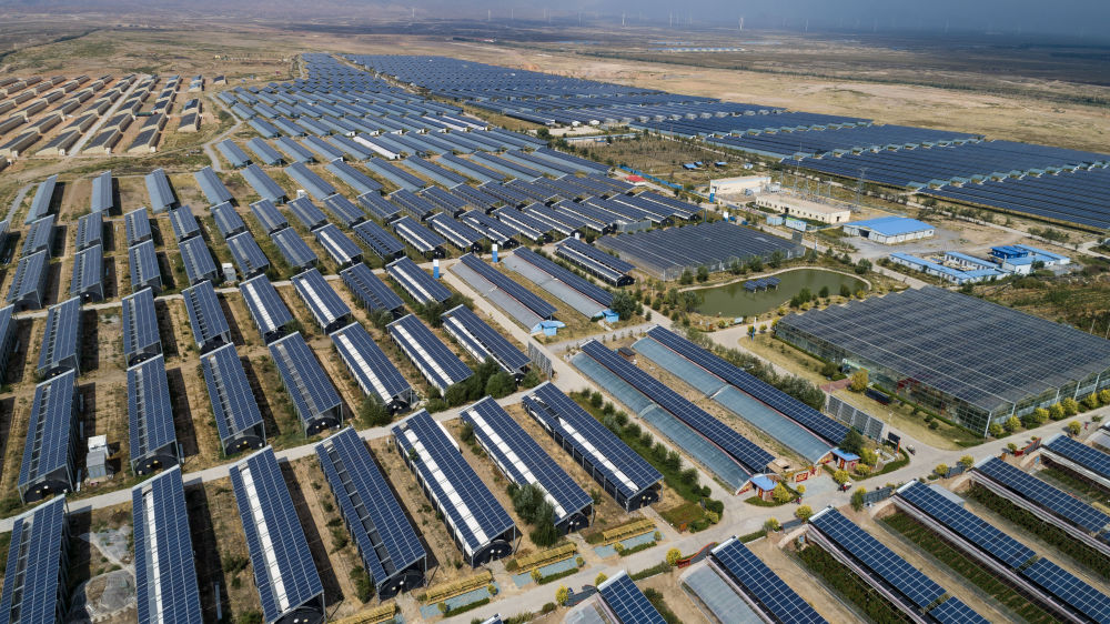 俯瞰宁夏银川市永宁县闽宁镇原隆村的光伏大棚(无人机照片,2019年9月3日摄)。新华社记者王鹏摄