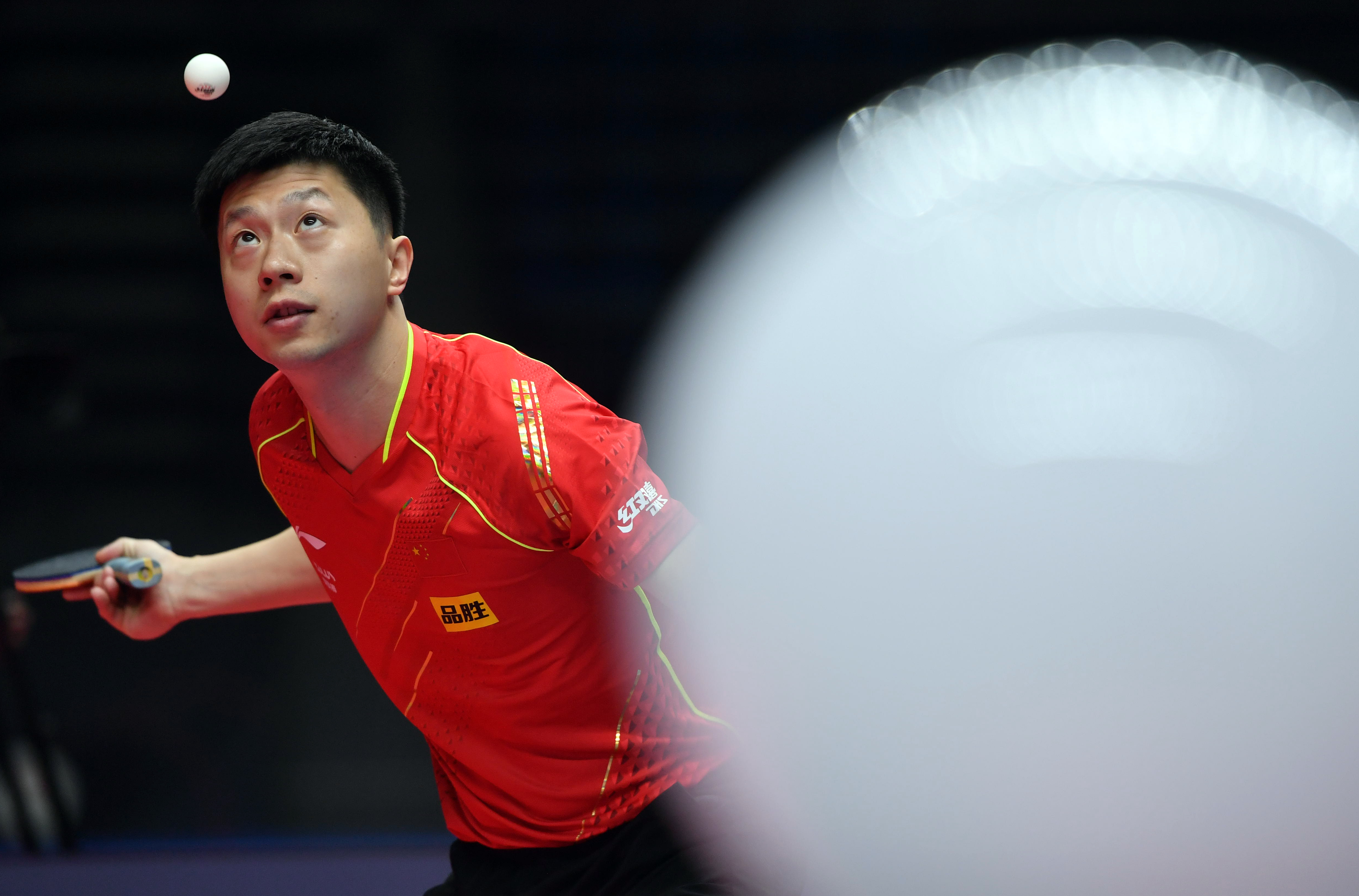 5月3日,马龙在比赛中发球。新华社记者 李嘉南 摄