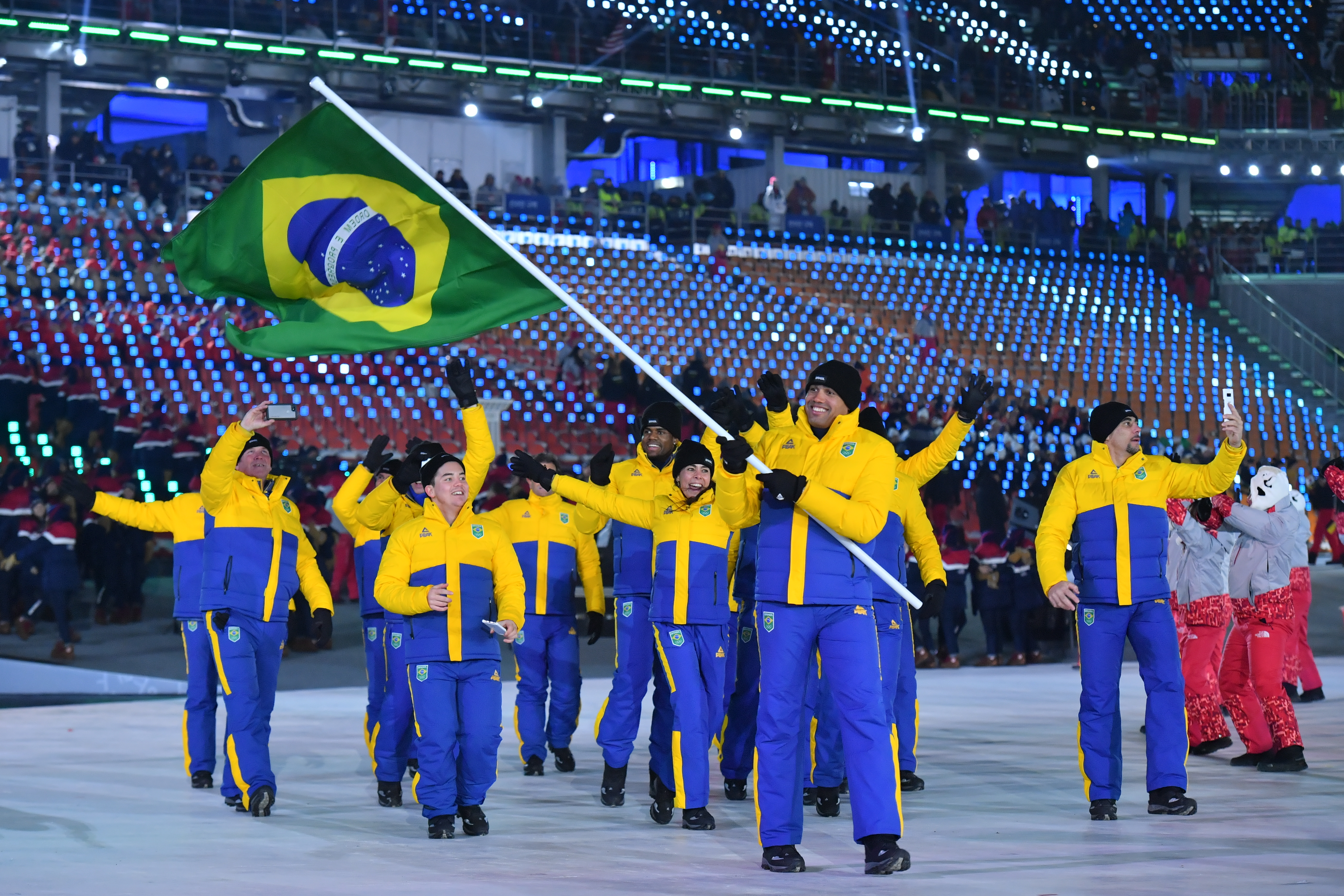 2018年2月9日,巴西代表团在开幕式上入场。当日,2018年平昌冬奥会开幕式在平昌奥林匹克体育场举行。新华社记者吕小炜摄