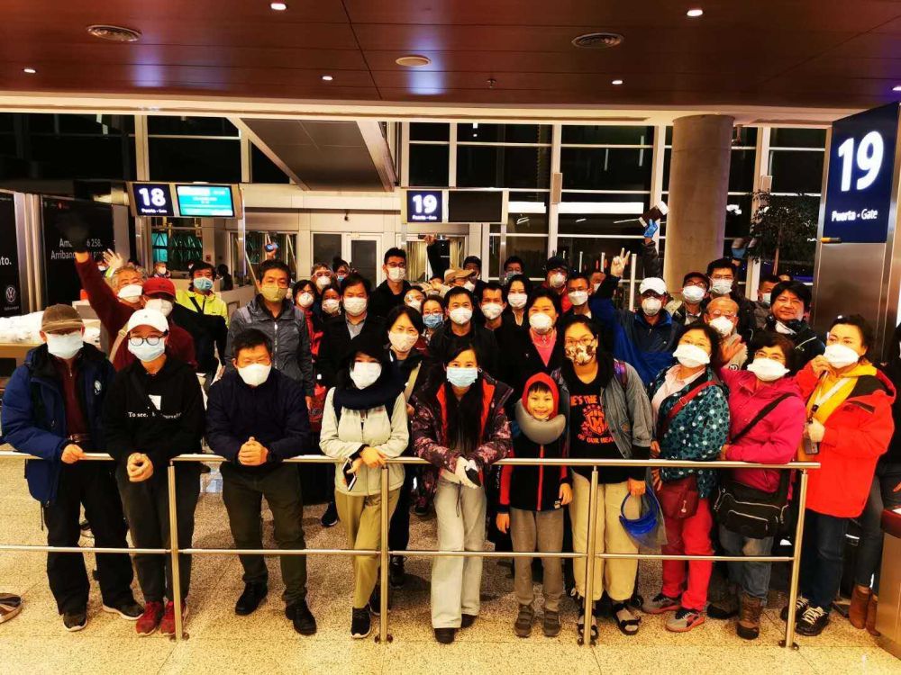 (中国游客和临时商务人员在机场合影,图片由受访者提供)