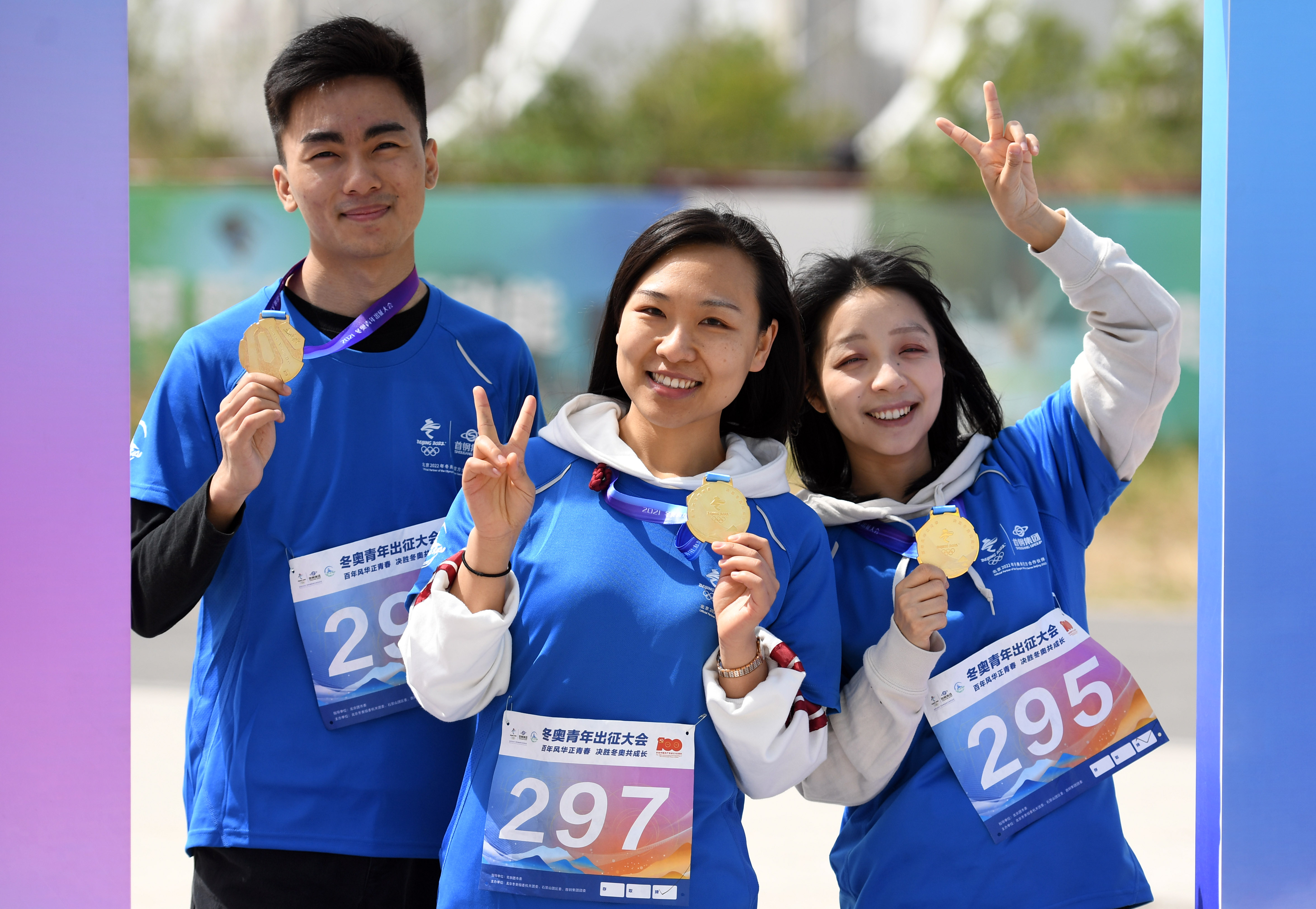 4月27日,冬奥青年出征大会在京举行,选手在完成5.4公里党史知识打卡跑活动后展示奖牌。新华社记者 任超 摄