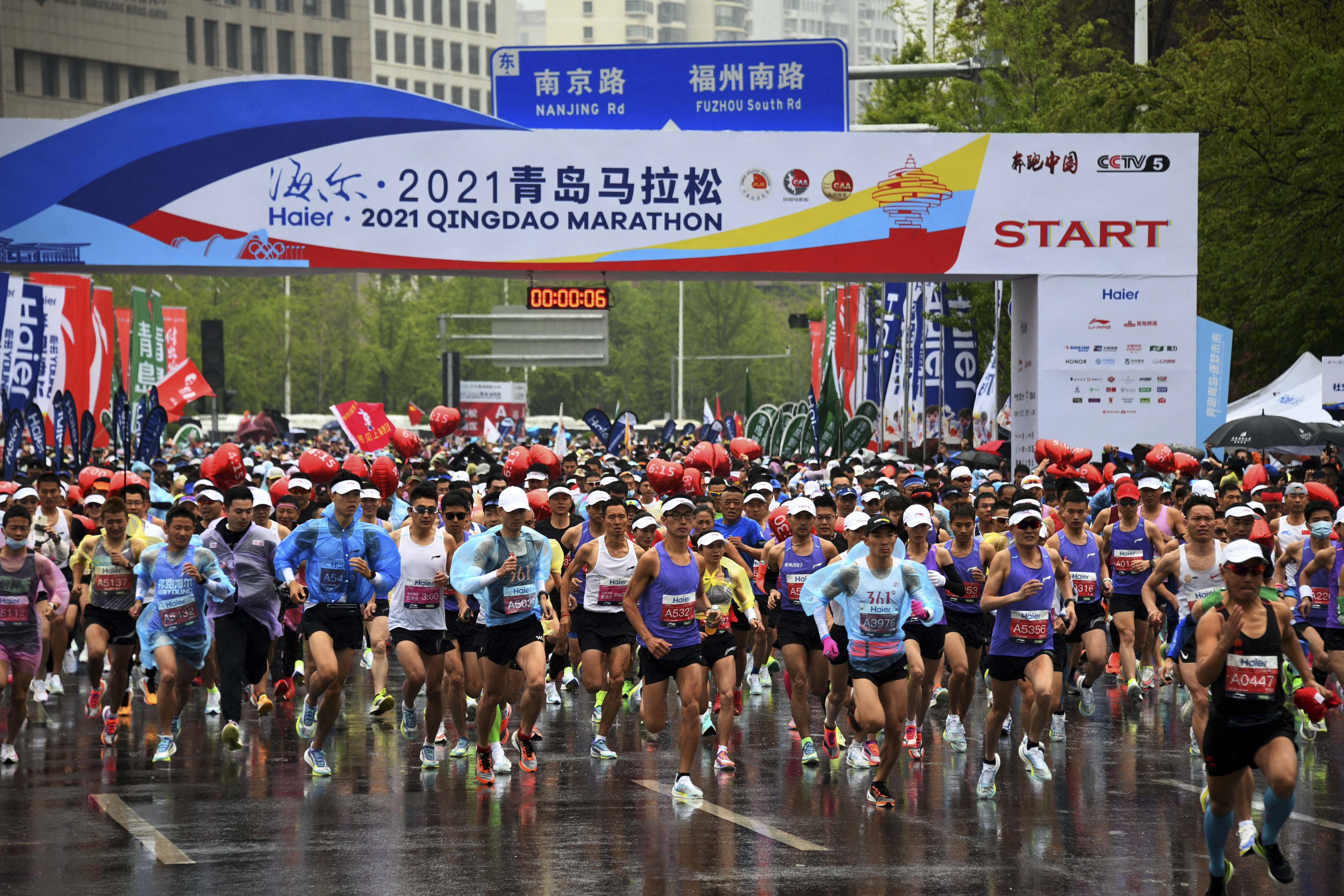 5月4日,参赛选手从起点出发。当日,2021青岛马拉松在青岛五四广场开跑。新华社记者 李紫恒 摄