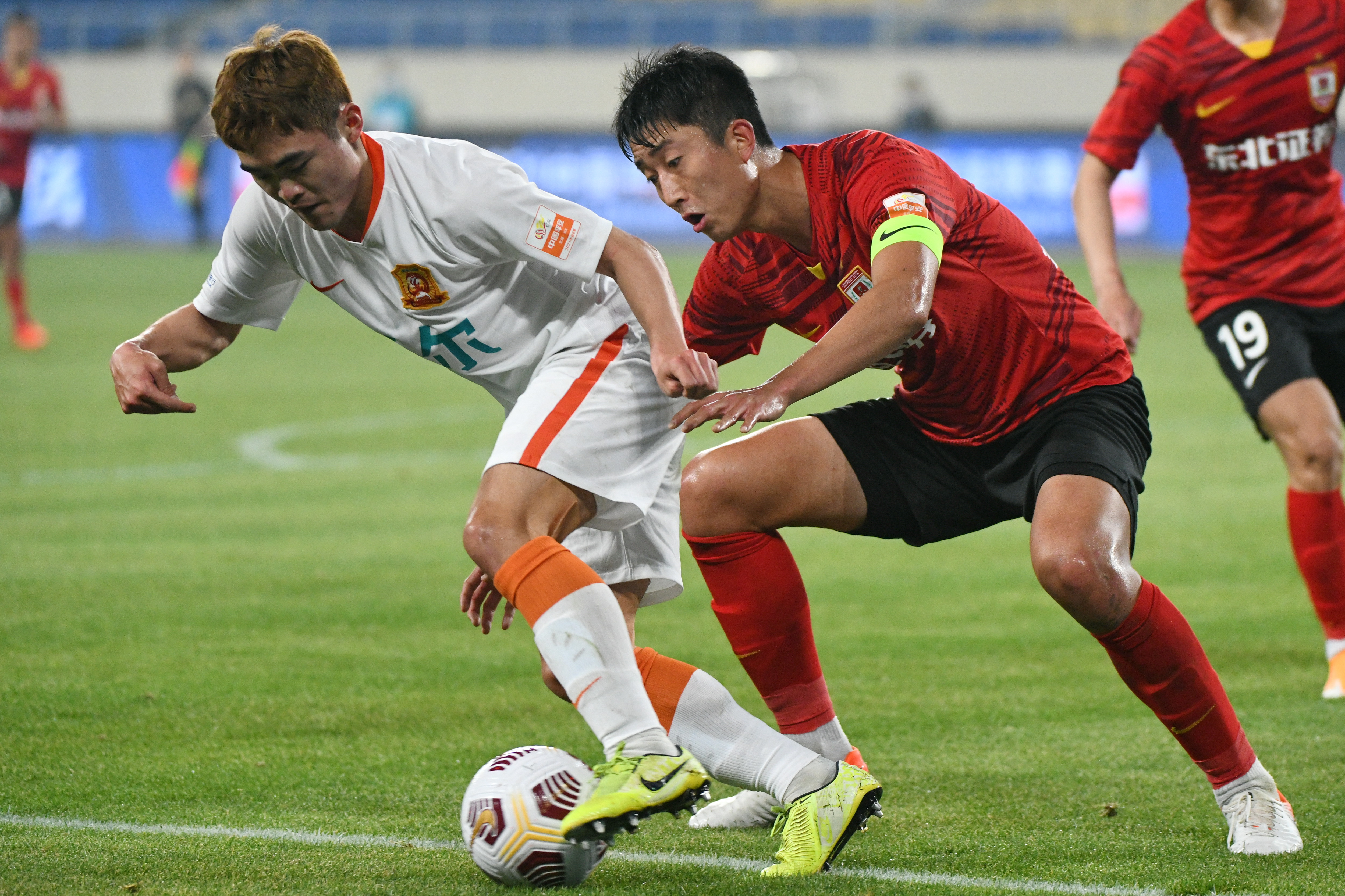 5月4日,武汉队球员黄紫昌(左)与长春亚泰队球员孙捷在比赛中拼抢。新华社发(史康摄)
