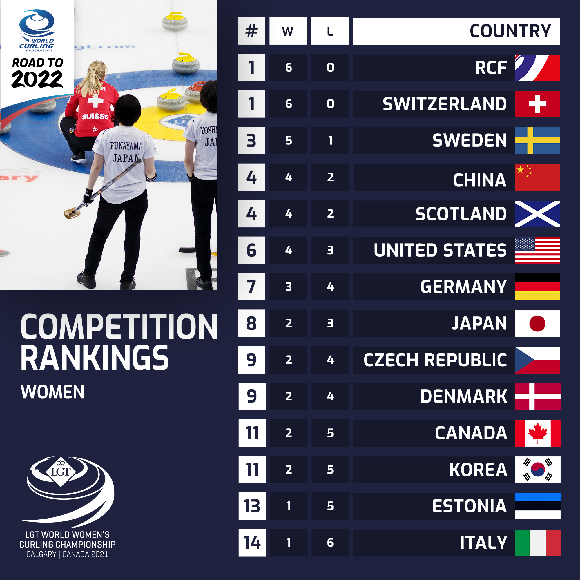 当日比赛过后,俄罗斯冰壶协会队与瑞士队均为六战全胜并肩领跑,五胜一负的瑞典紧随其后,中国队与苏格兰队四胜二负并列第四。