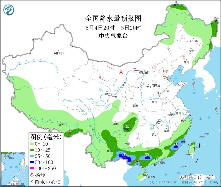 4日20时至5日20时,江南东部、华南、重庆中西部、云南东部等地部分地区有中到大雨,其中,福建南部、云南东南部、广西南部、广东西部等地部分地区有暴雨,局地大暴雨。