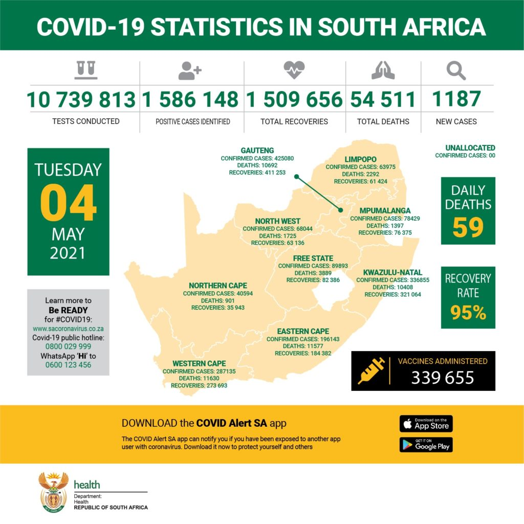 5月4日南非卫生部确认,南非当天新增新冠肺炎确诊病例1187例,新冠肺炎确诊总数达1586148例。南非全国已检测10739813人,当日检测24040人。