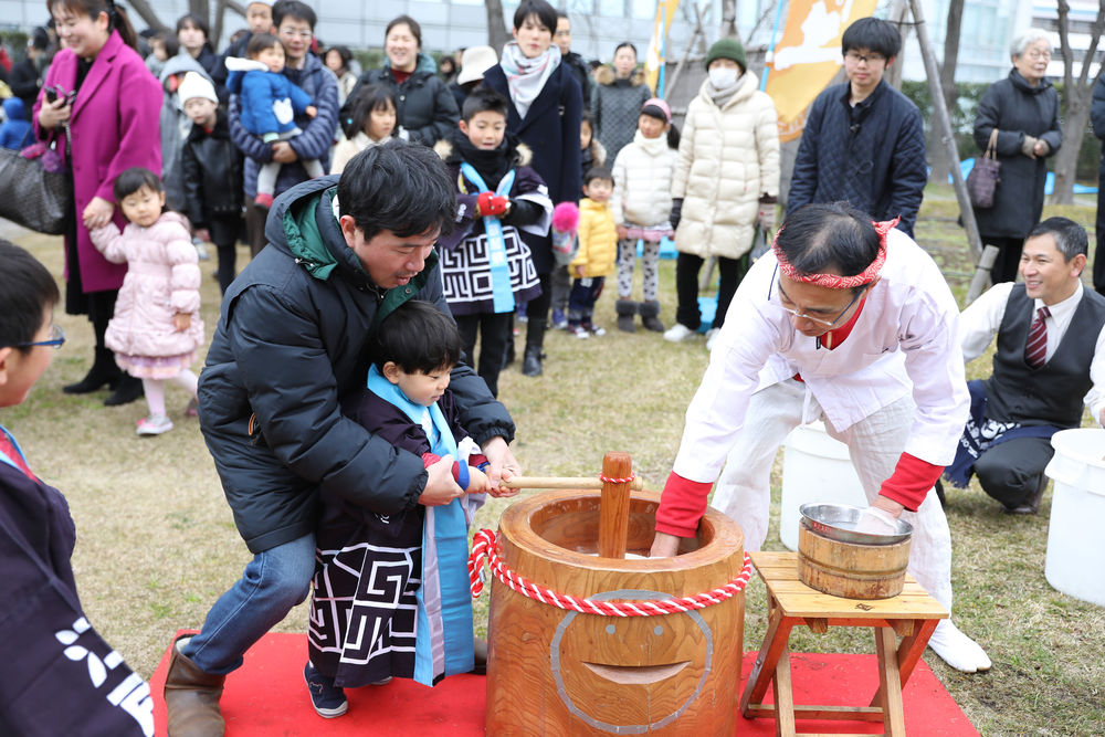 图为2019年1月12日,日本东京六本木新城举行捣年糕活动,一名儿童在家长的协助下捣年糕。(新华社记者杜潇逸摄)