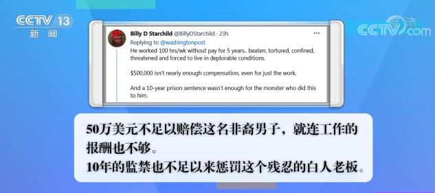 还有网友评论称,“50万美元不足以赔偿这名非裔男子,就连工作的报酬也不够。10年的监禁也不足以来惩罚这个残忍的白人老板。”