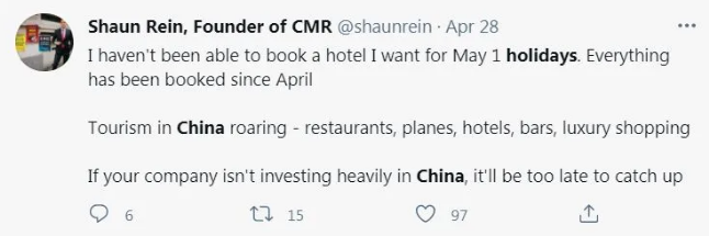 长期居住在中国的博主肖恩·赖恩说,自己没能预订到五一期间心仪酒店的房间,因为在4月就已经销售一空。