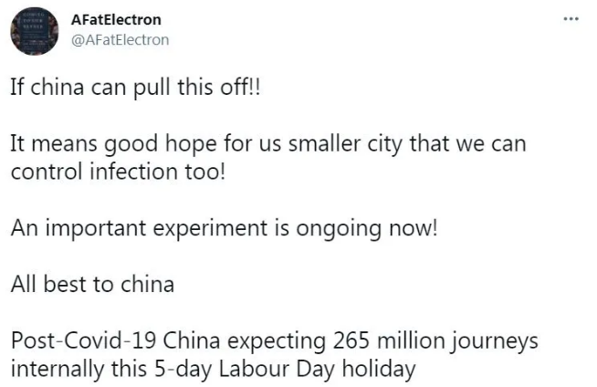 网友AFatElectron说:“如果中国能做到!这说明我们小城市控制疫情也有希望!”