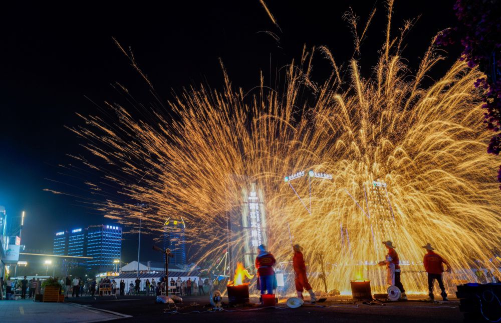 4月30日,工作人员在温州滨江大排档街区内为市民游客进行打铁花表演。新华社记者徐昱摄