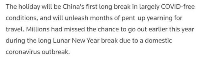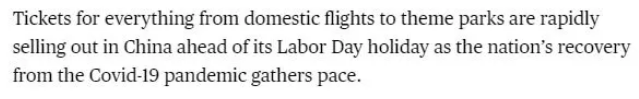 彭博社在报道的第一段就说:无论是国内航班的机票,还是游乐园的门票,在五一到来之前,所有的票都快速售罄,这显示出中国在后疫情时代的复苏逐渐提速。