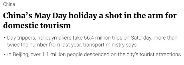 《南华早报》在报道中国五一假期时,就将“强心针”用在标题里。