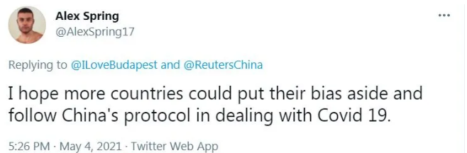 网友Alex Spring说,我希望更多国家放下偏见,参考中国的抗疫模式。