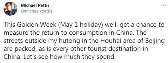 居住在北京后海附近的经济学者迈克尔·佩蒂斯说:“五一黄金周,我们将有机会测量中国消费水平恢复程度。我家附近的胡同已经人满为患,就像全中国任何一个旅游景点一样。让我们看看他们究竟会花多少钱。”