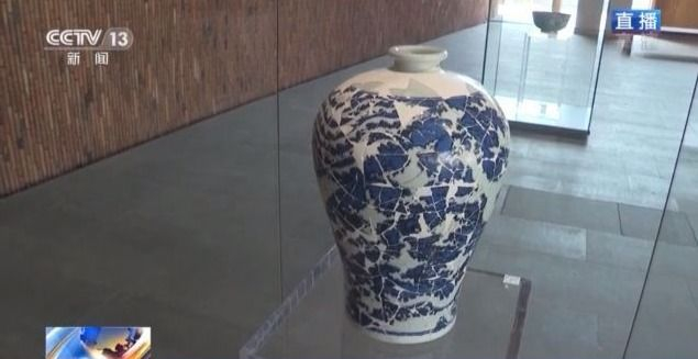 梅瓶,蓝白两色,轮廓清晰,它是由466片碎瓷片,历经近一年时间才修复完成的,全世界仅存1件。