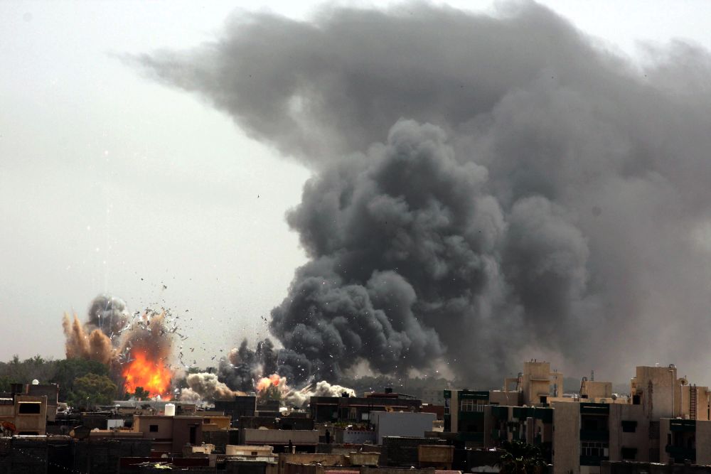 2011年6月7日,利比亚首都的黎波里,遭北约战机轰炸的地面目标剧烈爆炸升起浓烟。新华社发(哈姆扎·图尔基亚摄)