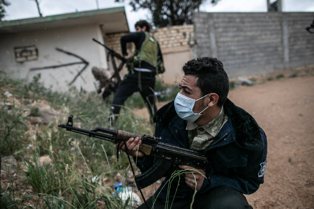 2020年3月25日,在利比亚的黎波里,利比亚民族团结政府武装人员戴着口罩在战斗。新华社发(阿姆鲁摄)