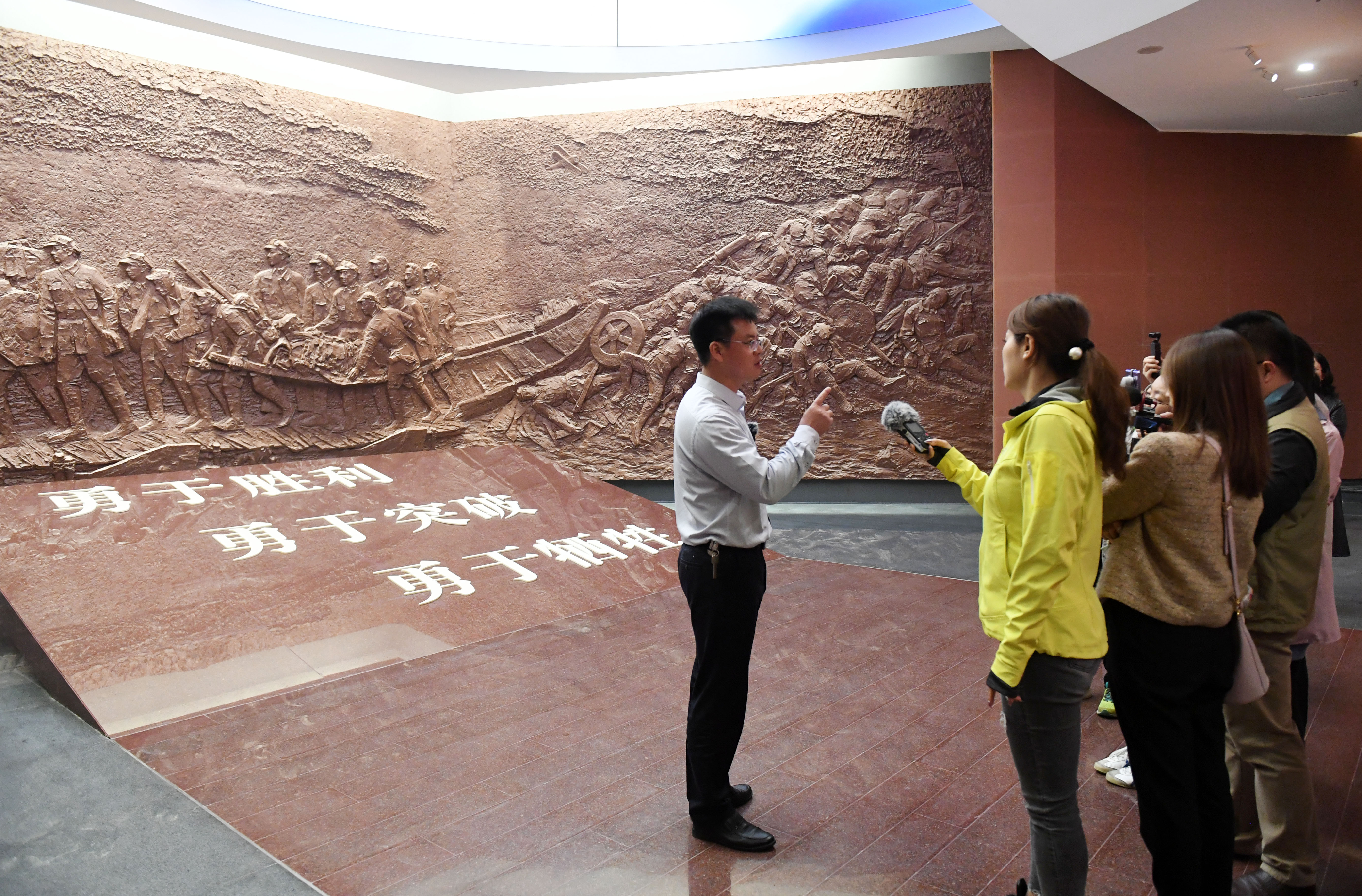 在兴安红军长征突破湘江纪念馆内,尹汤怀在讲解湘江战役历史和英烈故事。(新华社记者陆波岸4月27日摄)
