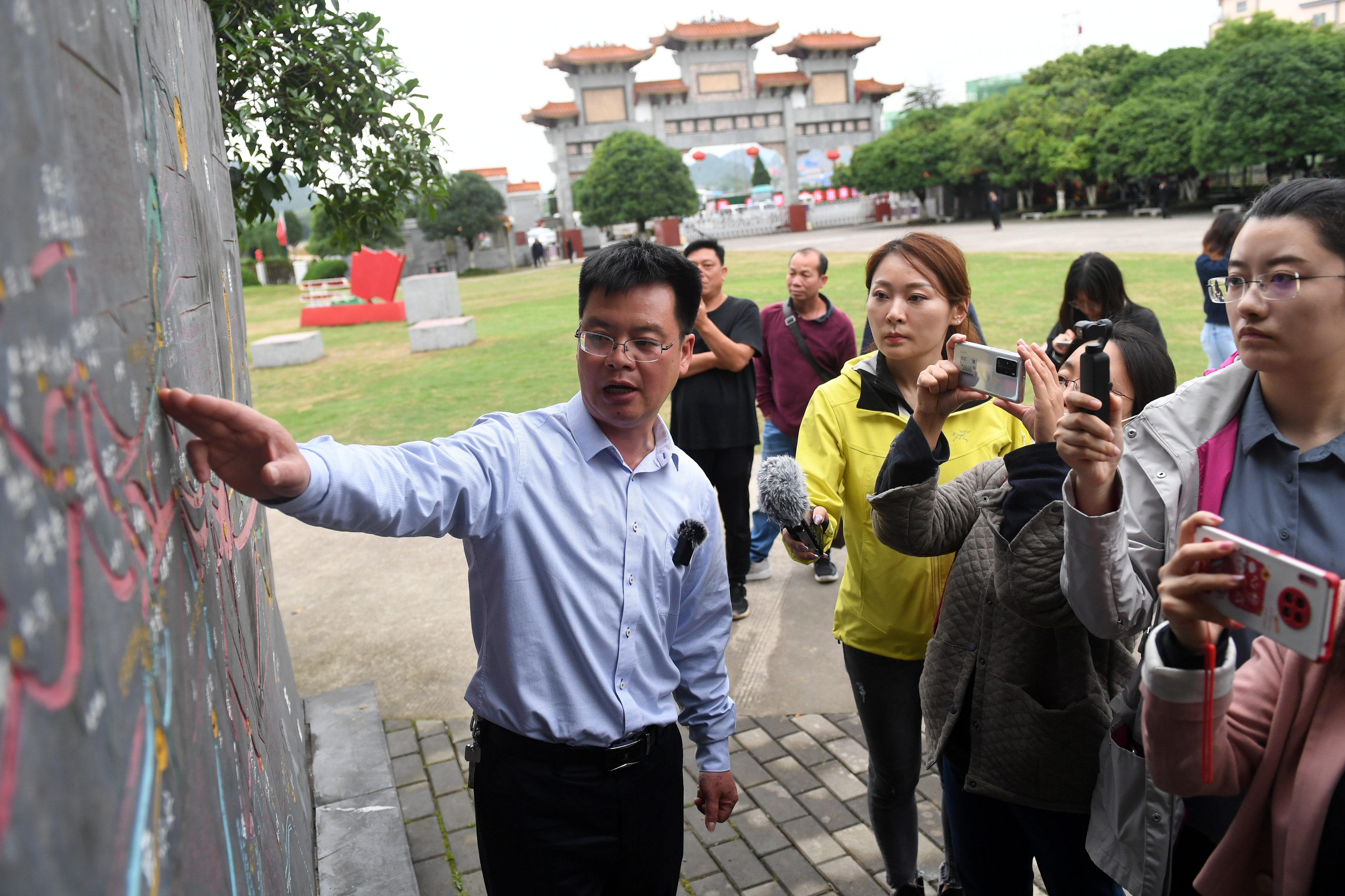 在兴安红军长征突破湘江烈士纪念碑园,尹汤怀正在进行讲解。(新华社记者陆波岸4月27日摄)