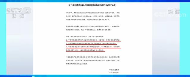 昨天(4日)晚间,中通快递发布了关于这一事件的情况通报。经调查核实,这批活体动物系平台电商客户线上销售,目前中通快递暂停成都荷花池网点揽收业务,配合相关部门调查。中通快递四川管理中心相关责任人停职检查,中通快递将开展全面自查整改。