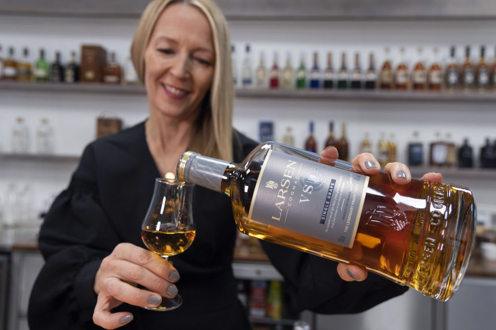 4月9日,在芬兰首都赫尔辛基,芬兰酒类饮料公司阿勒提亚市场总监基尔西·蓬蒂拉展示公司旗下的烈酒产品。她表示,公司将与中国分销商伙伴合作参展,期待借消博会开拓中国市场。(新华社发,马蒂·马蒂凯宁摄)
