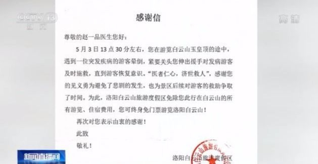 5月3日,在河南洛阳白云山景区,一名老人在游览途中突发疾病晕倒,赵医生不仅挺身而出进行抢救,还一直默默守护在老人身边,直到老人恢复意识。之后,赵医生也收到了一份意外的“礼物”。