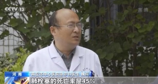 商丘市中心医院急诊科医生 魏兵:肺栓塞的死亡率是45%。她(患者)现在是急性心肌梗死,死亡率十倍还要多。尤其是她这种大面积肺栓塞,如果不能及时救治的话,十分钟到二十分钟,就没有生命了。