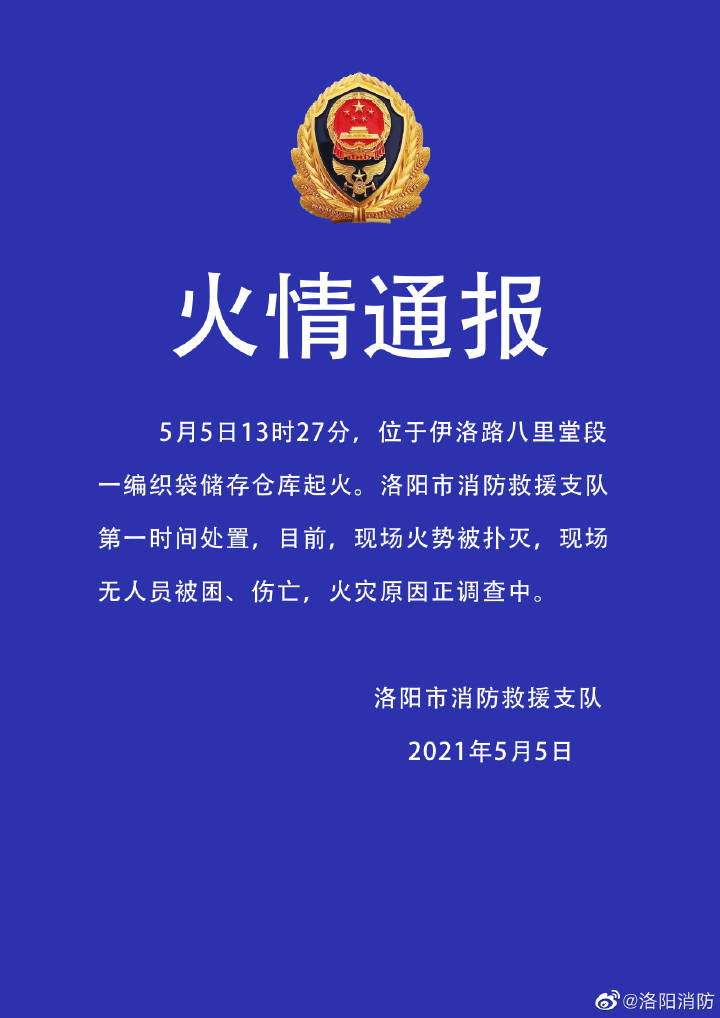 5月5日下午,偃师特大桥附近建筑物着火致徐兰高铁列车晚点。对此,洛阳消防发布通报称:5月5日13时27分,位于伊洛路八里堂段编织袋储存仓库起火。洛阳市消防救援支队第一时间处置,目前现场火势被扑灭,现场无人员被困、伤亡,火灾原因正调查中。