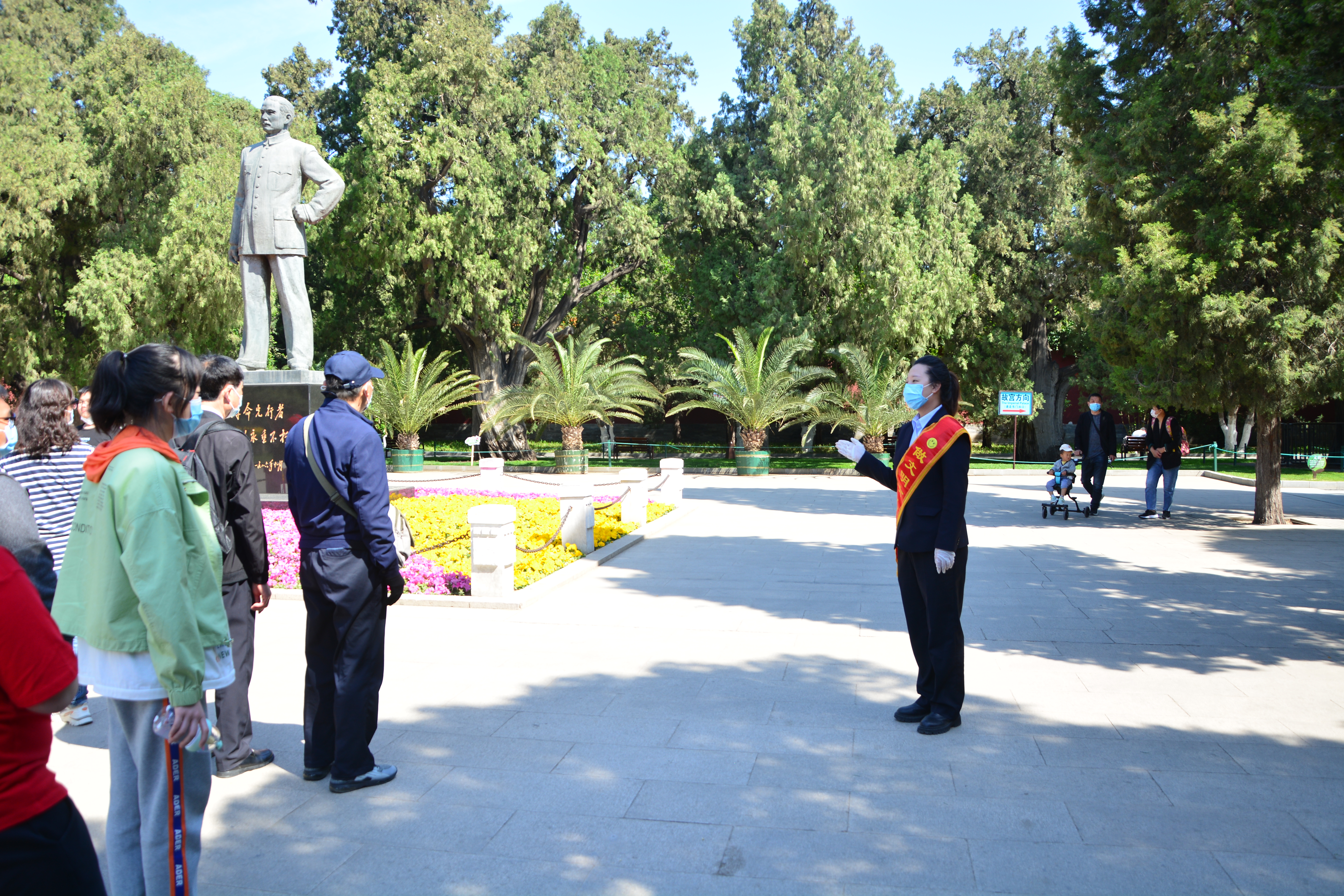 中山公园讲解员为游客进行红色经典线路讲解。(北京市公园管理中心供图)