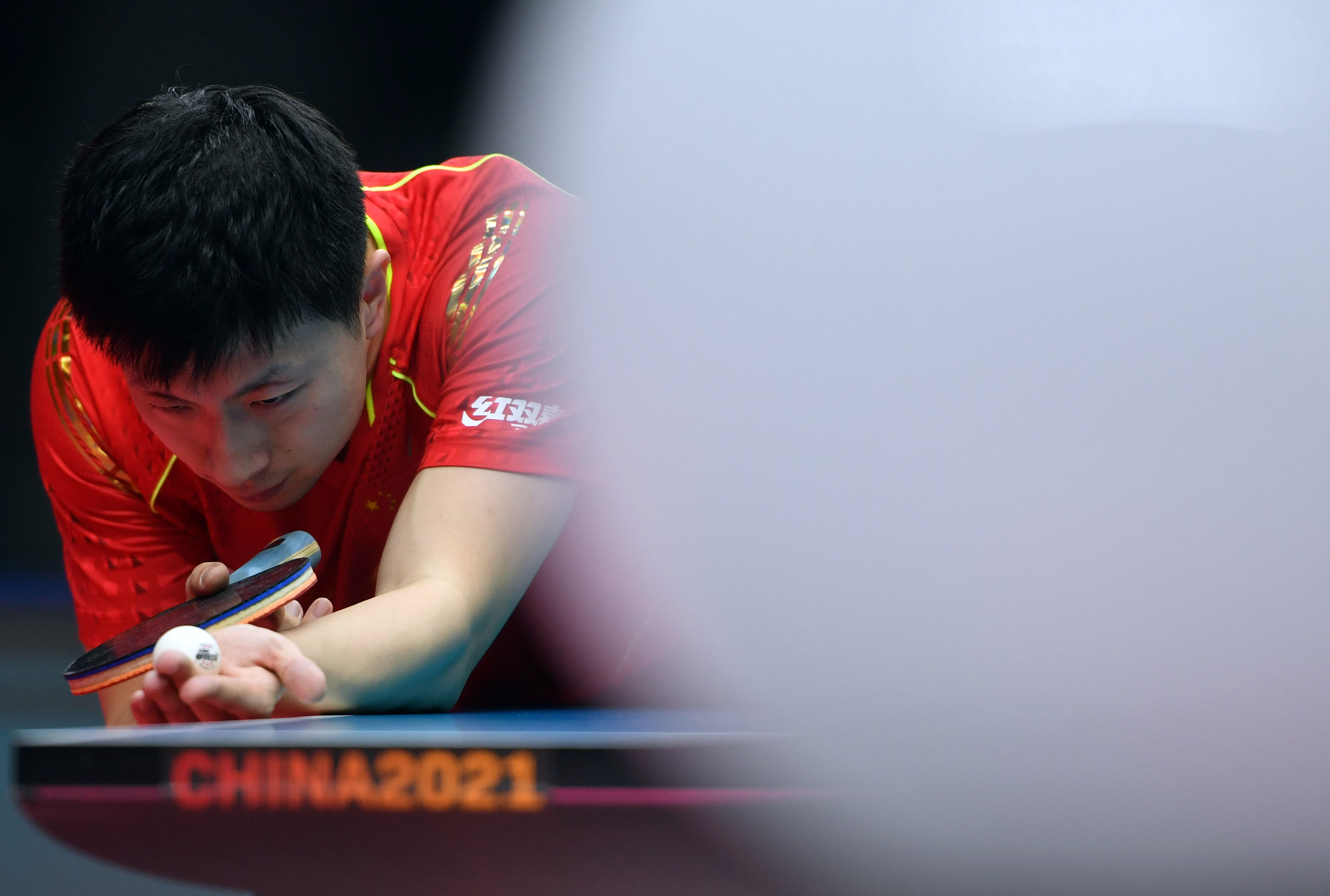 5月5日,马龙在比赛中发球。新华社记者李嘉南摄