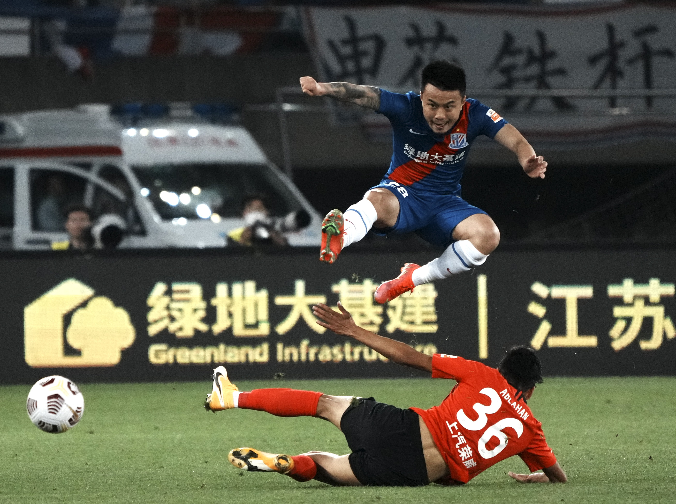 5月5日,上海申花队球员曹赟定(上)与上海海港队球员阿布拉汗·哈力克在比赛中拼抢。新华社记者朱峥摄