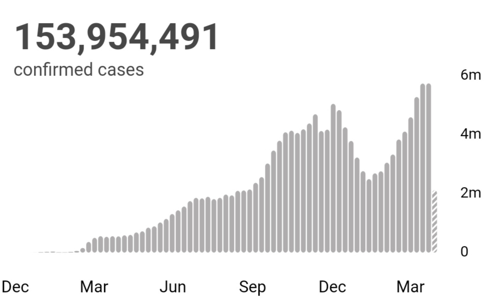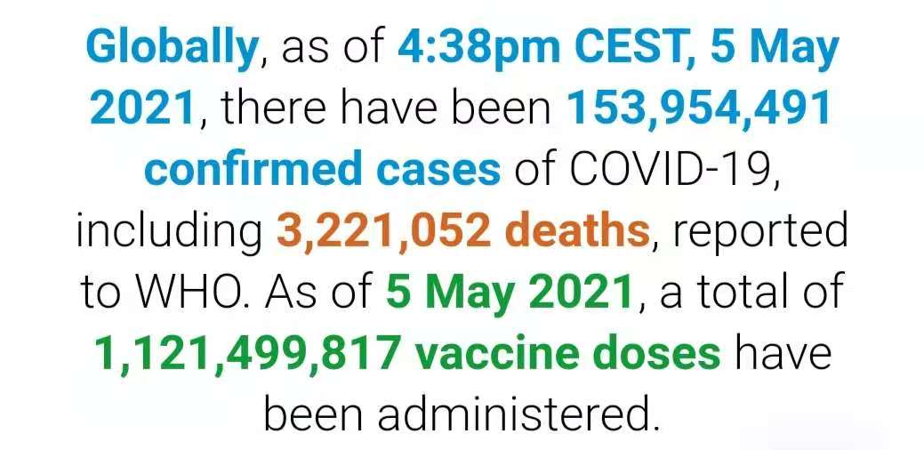 根据世卫组织最新实时统计数据,截至欧洲中部夏令时间5月5日16时38分(北京时间5月5日22时38分),全球累计新冠肺炎确诊病例达153954491例,累计死亡病例达3221052例。5日全球新冠肺炎确诊病例新增721398例,死亡病例新增11491例。(总台记者 朱赫)