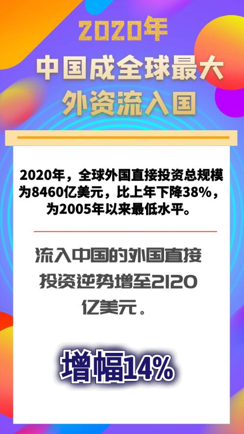 央视网消息:2020年全球外国直接投资总规模为8460亿美元,比上年下降38%,为2005年以来最低水平。其中,流入中国的外国直接投资逆势增至2120亿美元,增幅为14%。专家表示,得益于有效控制新冠疫情及诸多行业加速开放,去年中国超过美国成为全球最大外资流入国。