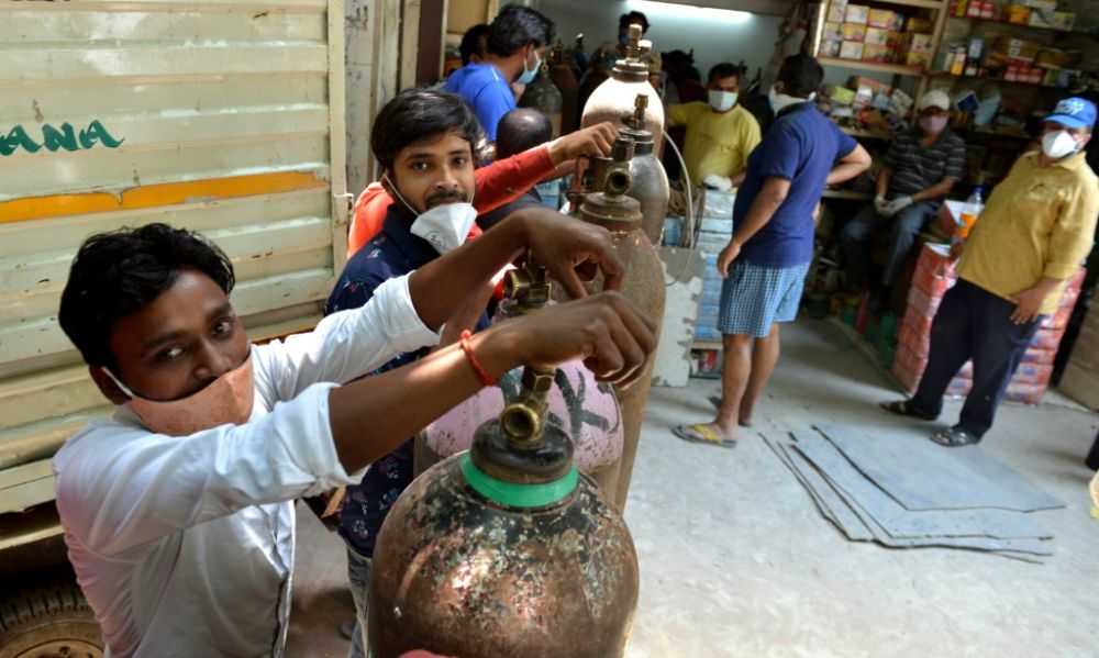 5月5日,人们在印度新德里等待填充氧气瓶。(新华社发,帕塔·萨卡尔摄)